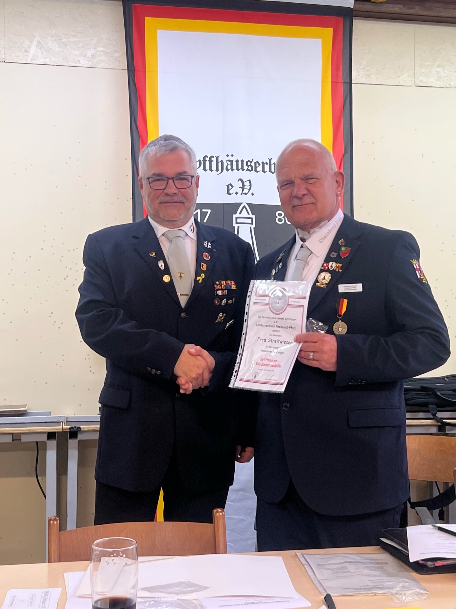 Nach Verlesung einer Grußbotschaft des Ehren Landesvorsitzenden Günter G. Lentz und dem Gedenken an die verstorbenen Kameradinnen und Kameraden wurden verdiente Mitglieder geehrt.